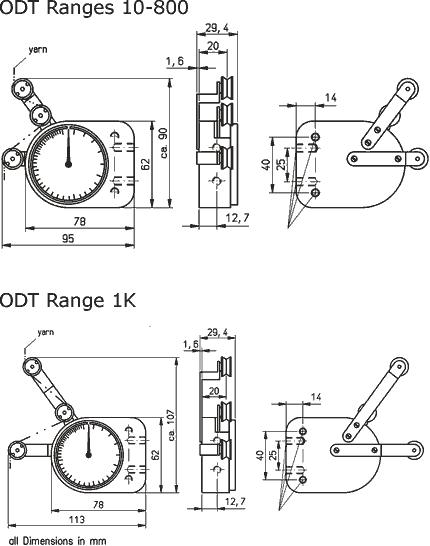 The CHECK-LINE model ODT Tension Meter accurately measures running line tensions on a wide variety of yarns, fibers, wires, etc. It's designed for fixed mounting for continuous tension measurement.