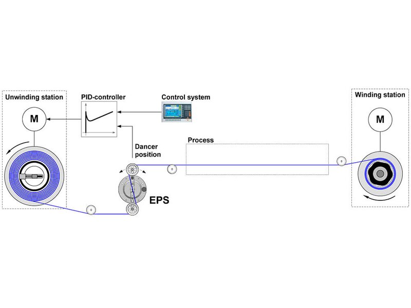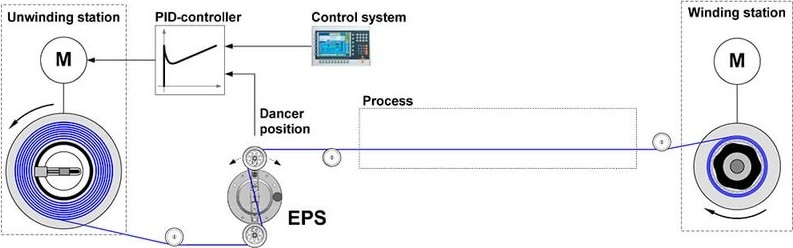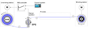 EPS is a control dancer and used for tension control on winding of endless material. It is an active dancer system