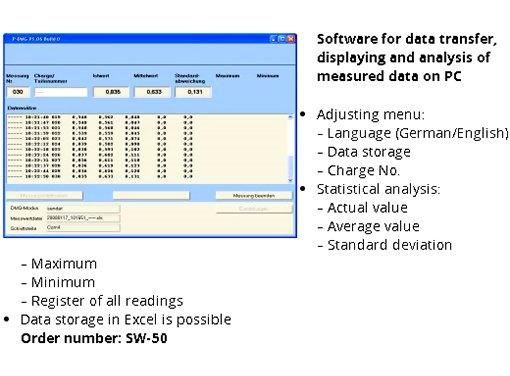 This alternative to the D-2010 does not have an illuminated, menu controlled touch-screen with its statistics functions, instead it is equipped with a dial gauge with seven-segment display and individual keys. Of course, there is a data output for the digital processing of the measurement results.