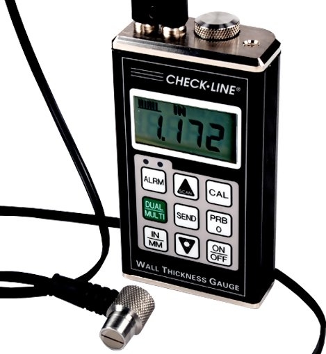 Measuring Range in Steel Pulse-Echo Mode (Pit & Flaw Detection) measures from 0.025 to 19.999 inches (0.63 to 500 millimeters). Echo-Echo Mode (Through Paint & Coatings) measures from 0.1 to 1 inch (2.54 to 25.4 millimeters). The TI-25M-MMX Through Paint Ultrasonic Thickness Gauge accurately measures wall thickness and the extent of corrosion of all metals, ceramics, glass and most rigid plastics - from only one side! TI-25M-MMX Through Paint Ultrasonic Thickness Gauges can be used in a Single Thickness Reading mode or in a Scan mode , where the probe is dragged over a large measuring area. The minimum thickness reading recorded during the "scan" will be displayed. The TI-25M-MMX Through Paint Ultrasonic Thickness Gauge probe is waterproof and can be submerged in water. The gauge is impact-resistant and environmentally sealed to provide trouble-free operation under the toughest field conditions.