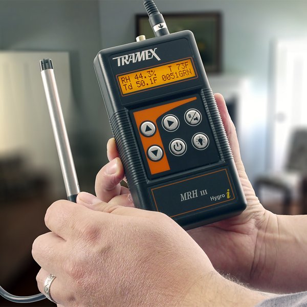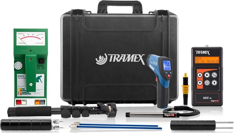 The Building Survey Master Kit features the multifunctional Tramex MRH3 digital moisture meter allowing for non-invasive testing of moisture conditions in numerous building materials such as drywall, wood, plaster, brick, ceramic tiles, resilient flooring, laminates and roofing