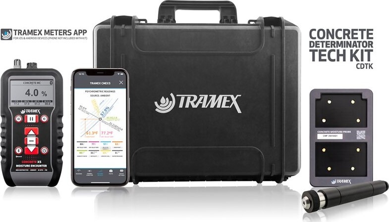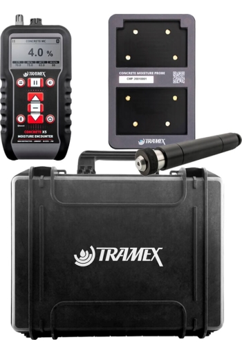 A compact kit for instant and precise testing of both Surface and In-Body concrete Moisture Content in floors and slabs using a unified gravimetric-based testing method. The Tramex CMEX5 Concrete Moisture Encounter X5 allows for non-destructive quantitative testing of concrete and comparative testing per ASTM F2659. The reusable Concrete Moisture Determinator Probe used with the CMEX5 allows for in-depth moisture content probe testing within the concrete, down to an extendable depth of up to 4" (100mm). The Concrete Determinator Tech Kit comes in a protective heavy-duty carrying case with die-cut foam lining. The Tramex Meters App allows you to GeoTag test results, create, save and share reports and charts.