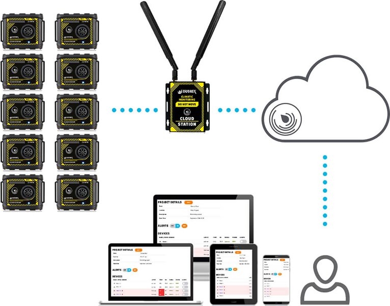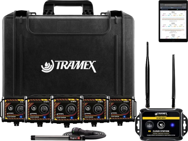 The Tramex TREMS-Xtra Remote Environmental Monitoring System Xtra comprises a Tramex Cloud Station router, CS-RHTX Tramex Cloud Sensors for ambient conditions, as well as external Relative Humidity probes. These external probes extend the benefits of the remote monitoring system allowing for in-situ readings within building structures cavities in walls and ceilings and in situ RH readings in concrete.