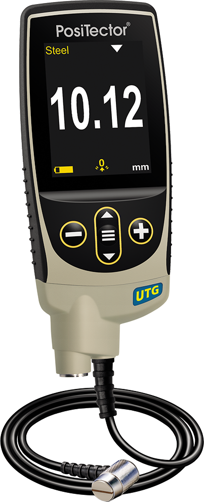 The PosiTector UTG C (Corrosion) single echo probe uses a dual-element transducer, a focused “V-path”, and V-path compensation to accurately measure the thickness of metals with particularly heavy corrosion or pitting. The UTG C single echo probe will not ignore the thickness of the exterior coating: for best measurement accuracy, it may be necessary to remove any coating present at the point of measurement.The PosiTector UTG M (Multi-echo) probe uses a single element transducer to accurately measure the metal thickness of a new or lightly corroded structure while ignoring the thickness of protective coatings. The ultrasonic beam travels in a straight path to the material’s back wall at 90° relative to the surface. When three consecutive back wall echoes are detected, the probe makes a time-based calculation to eliminate the coating thickness from the gage reading.