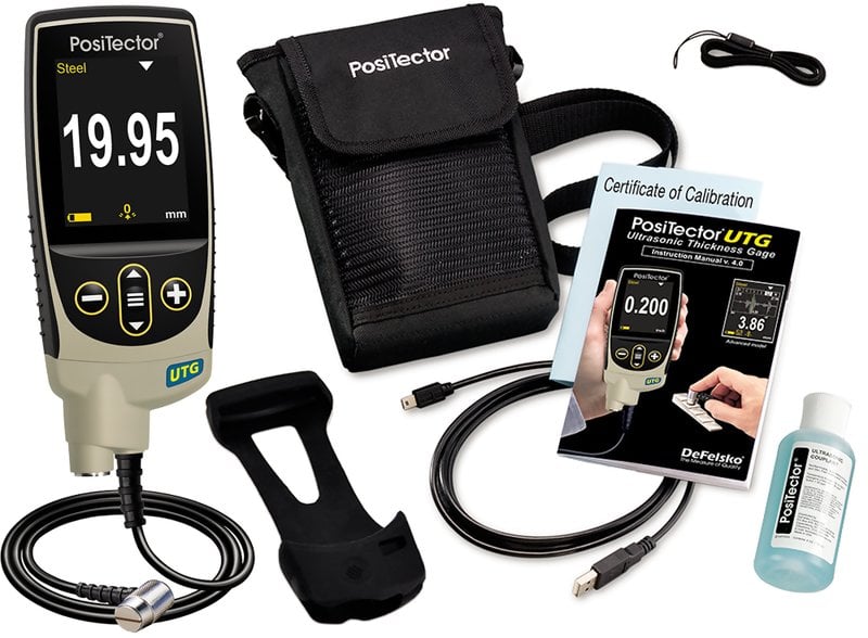 The DeFelsko PosiTector UTG CLF1 Standard Ultrasonic Thickness Gage Kit includes everything needed for testing: