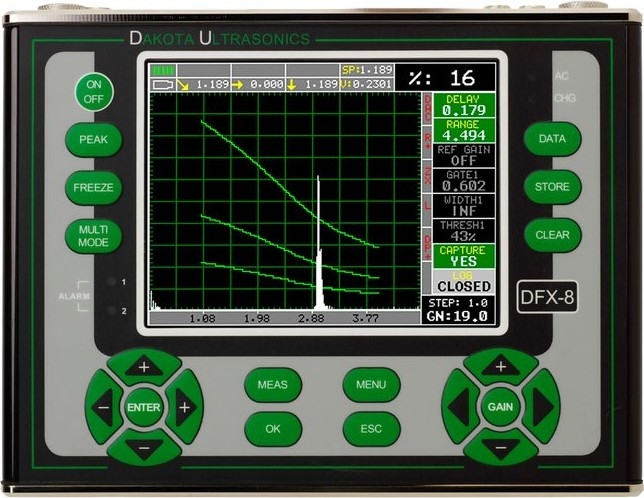 The powerful Dakota Ultrasonics DFX-8 combination Flaw Detector + Thickness Gauge Z-250-0001 is ideal for a wide range of measurement applications. The DFX-8 features a large QVGA display with 60 Hz refresh rate. For flaw professionals it includes DAC, AWS, TCG, DGS sizing toolkits. When functioning as a thickness gauge it can measure in Pulse-Echo, Echo-Echo and other advanced modes for accurate measurements on coated and uncoated materials.