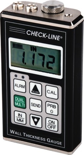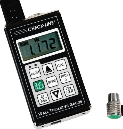 Measuring Range in Steel Pulse-Echo Mode (Pit & Flaw Detection) measures from 0.025 to 19.999 inches (0.63 to 500 millimeters). Echo-Echo Mode (Through Paint & Coatings) measures from 0.1 to 1 inch (2.54 to 25.4 millimeters). The TI-25M-MMX Through Paint Ultrasonic Thickness Gauge accurately measures wall thickness and the extent of corrosion of all metals, ceramics, glass and most rigid plastics - from only one side! TI-25M-MMX Through Paint Ultrasonic Thickness Gauges can be used in a Single Thickness Reading mode or in a Scan mode , where the probe is dragged over a large measuring area. The minimum thickness reading recorded during the "scan" will be displayed. The TI-25M-MMX Through Paint Ultrasonic Thickness Gauge probe is waterproof and can be submerged in water. The gauge is impact-resistant and environmentally sealed to provide trouble-free operation under the toughest field conditions.