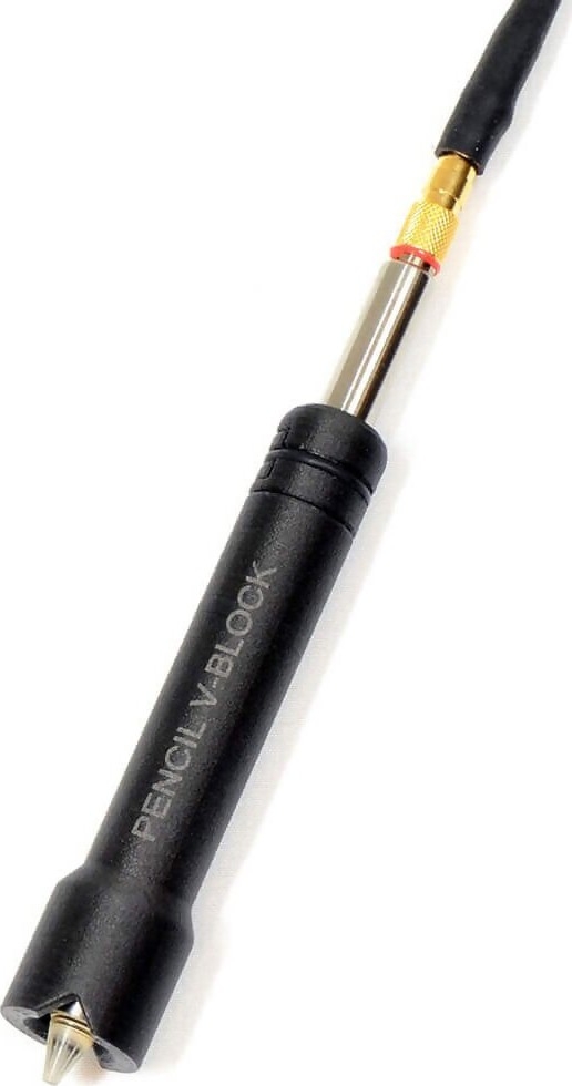 The F-000-7000 V-Block Probe Holder Pencil Probe transducer holder provides enhanced control when measuring small circular items and other curved surfaces. It can also be used on flat surfaces for better repeatability and quick perpendicular placing of the probe to achieve quick and easy repeatable measuring results