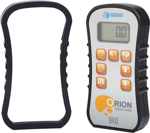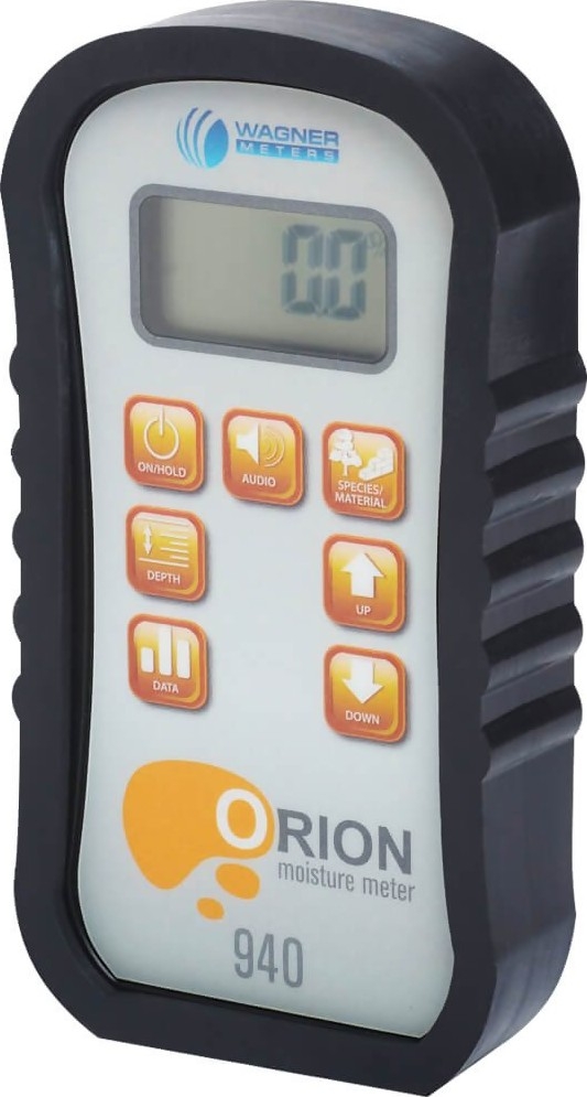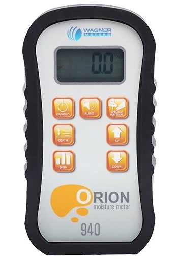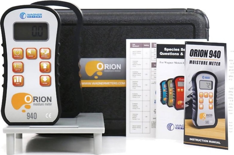 The Wagner Orion® 940 Data Collection Pinless Wood Moisture Meter Kit features the Orion 940 meter, designed for measurement of moisture content from the surface down to .25” (6.4mm) or .75” (19mm) deep inside wood or other materials. The Wagner Orion 940 Moisture Meter also features data collection and storage capabilities vital to Quality Control and home or property restoration applications.